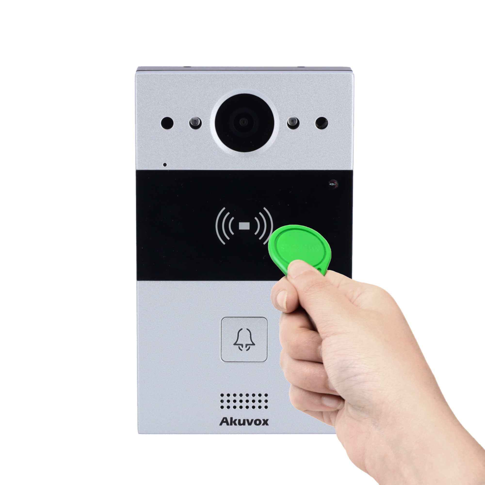 The video door entry panel is installed outside the premises and is often referred to as the outdoor unit. It allows visitors to make calls to building staff and also provides door-opening functionality via its integrated relay outputs. This model features two relay outputs, enabling the control of up to two doors simultaneously. In addition, it includes built-in access control, supporting user identification through RFID cards or key fobs (EM 125 kHz and MIFARE 13.56 MHz), as well as NFC.