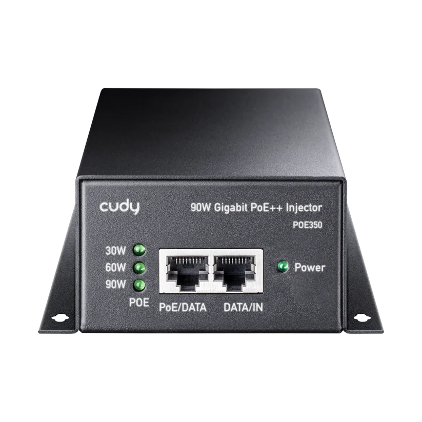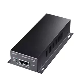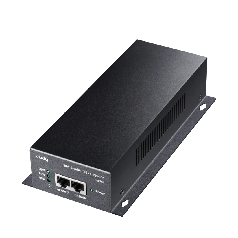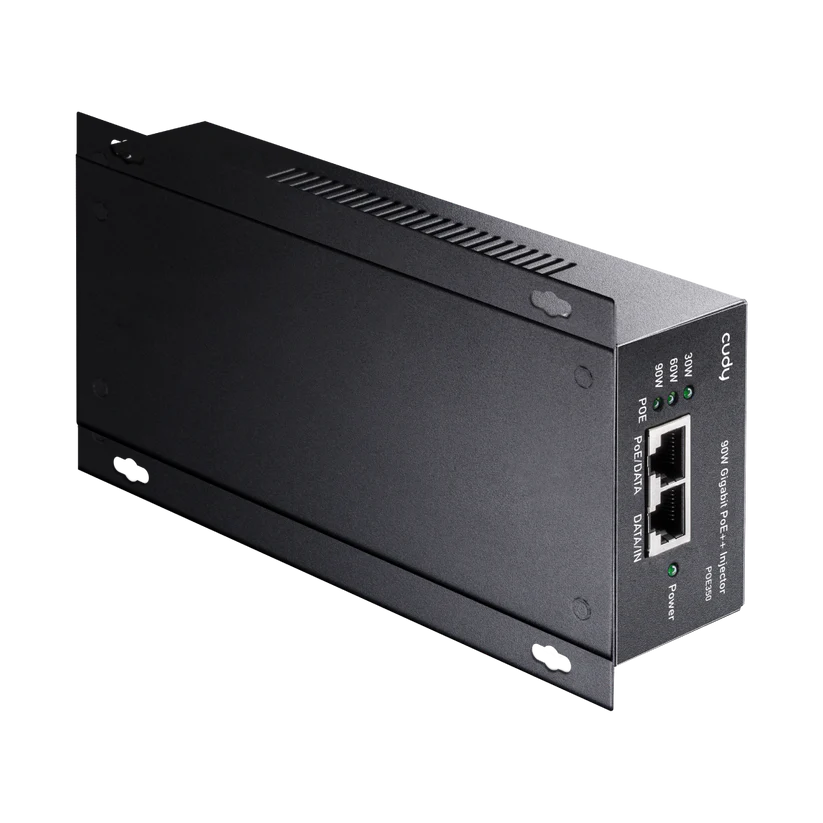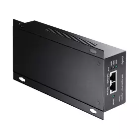A wall-mounted metal casing PoE adapter injecting up to 90W power to the Ethernet cable to power up the PoE device. Featuring brackets to be firmly attached to the wall.