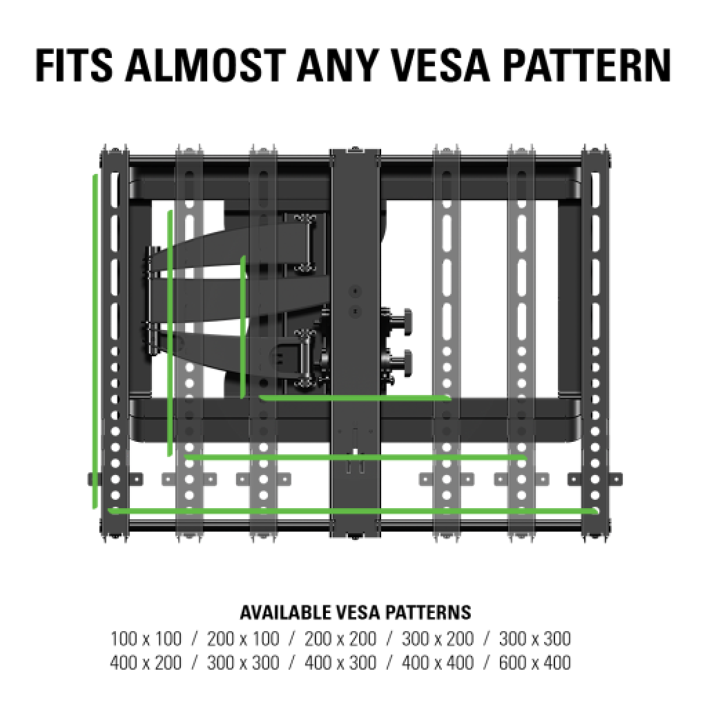 The VMF620 full-motion+ mount lets you enjoy a great picture no matter where you watch. Tilt, swivel, extend and level your TV without the need for tools. Unsightly cables stay concealed, and tool-free assembly ensures a quick and easy installation. TV can slide from side-to-side for perfect positioning on the wall, and safety tab provides a safe and easy connection you can hear.